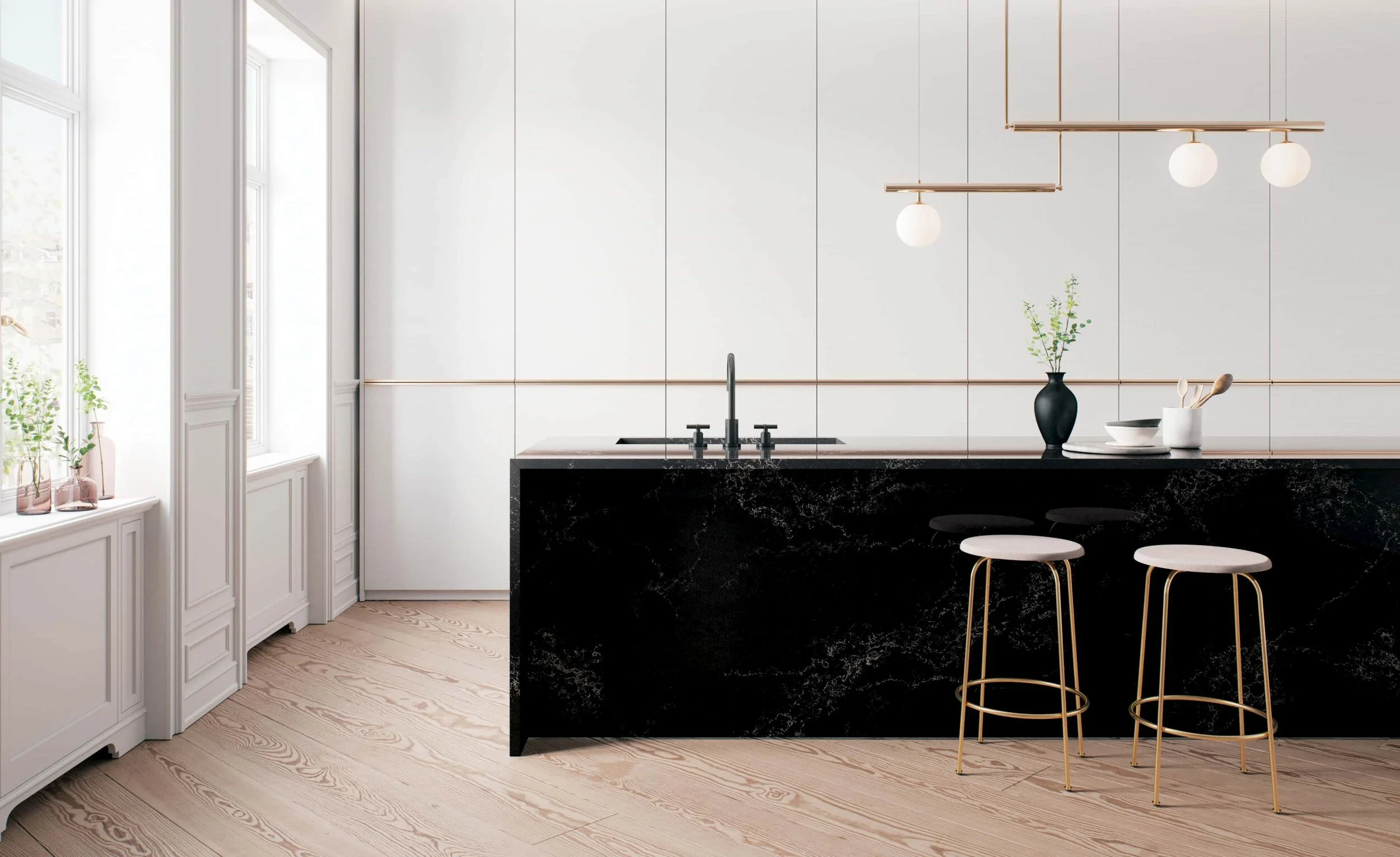 Caesarstone’s new Dark Collection embraces a contemporary trend in kitchens and bathrooms that has recently set a bold tone. Today, black has been reconsidered as a modern classic, used as a stark accent or a powerful overall look. Furniture, tabletops, flowers and food are just some of the lifestyle elements that have turned to black. Dark slate and stone, along with oxidized metal and black lacquered wood, are among the remarkable materials being combined in dramatic interiors and hospitality spaces.